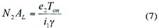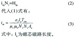 式中:e2為次級(jí)感應(yīng)電壓,Ton為導(dǎo)通時(shí)間,N2為次級(jí)線圈匝數(shù),Ae為磁芯有效截面積,△B為工作磁感應(yīng)強(qiáng)度,單位為特斯拉(T)。
