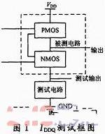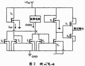 IDDQ測試是對功能測試的補充。通過測試靜態(tài)電流IDDQ可檢測出電路中的物理缺陷所引發(fā)的故障。IDDQ測試還可以檢測出那些尚未引起邏輯錯誤,但在電路初期會轉(zhuǎn)換成邏輯錯誤的缺陷。本文所設計的IDOQ電流測試電路對CMOS被測電路進行檢測,通過觀察測試電路輸出的高低電平可知被測電路是否有物理缺陷。測試電路的核心是電流差分放大電路,其輸出一個與被測電路IDDQ電流成正比的輸出。測試電路串聯(lián)在被測電路與地之間,以檢測異常的IDDQ電流。