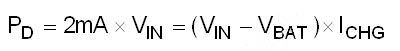 假設使用5.5V電源供應器對單顆1200mAh鋰離子電池進行充電,在0.7°C快速充電電流時,且電池電壓為3V的條件下,可以預估IC運作的最大耗電量為,1.762W的耗電最大值,此一功耗會使得熱阻抗60°C /W的3×3毫米QFN封裝溫度溫升127°C,即便環(huán)境溫度0°C時,也已經超過所允許的125°C硅晶片操作溫度最大值。若設定充電電流為0.6A(0.5C),則可降低IC溫升為90度,可以操作于35度的環(huán)境溫度中,因此是較佳的設定電流。