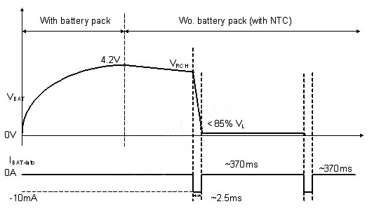 使用者亦有可能在充電或式充電完畢后,在未將電源移除的情況下,即抽離電池的情況。為避免造成危險,IC內部應具有如圖7, 8的電池存在偵測機制。充電IC會以短時間脈沖(每370ms產生2ms的脈沖)方式抽取電池電流,此時若電池存在,則偵測到的電池電壓應大于一預設閥值;若電池已切離,則充電IC偵測到一低電壓,即可判定為電池斷開狀態(tài),并將電池端電壓切斷,保護使用者安全。