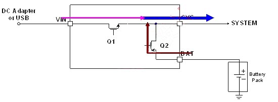 LD6275具有適應性電源路徑管理(Adaptable Power Path Management, APPM)功能,其為以供給系統(tǒng)端用電為主,對電池充電為輔,如圖3所示;當系統(tǒng)用電超過輸入電源的供給限制時,其電池亦能主動開啟放電功能同時對系統(tǒng)端供給其所需之電能需求,如圖4所示。