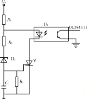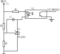 電壓反饋電路如圖3所示,輸出電壓通過集成穩(wěn)壓器TL431和光耦反饋到UC3843(1)腳,調節(jié)R1、R2分壓比可設定和調節(jié)輸出電壓,達到較高的穩(wěn)壓精度。如果輸出電壓Uo升高,集成穩(wěn)壓器TL431陰極到陽極的電流增大,使光耦輸出三極管電流增大即UC3843(1)腳對地的分流變大,UC3843輸出脈寬相應變窄,輸出電壓Uo減小。同樣地,如果輸出電壓Uo減小,可通過反饋調節(jié)使之升高。