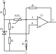 圖4為變壓器過熱保護電路,R3=R4,NTC為粘貼在變壓器上的負溫度系數的熱敏電阻,常溫下RNTCR2,運放U1構成滯環(huán)比較器。正常工作時,NTC阻值較大,運放U+<U-,輸出為零;當溫度上升到設定值時,運放U1輸出為高電平,送到PWM控制芯片使輸出脈沖關斷。