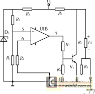 圖6為空載保護電路。為了防止變壓器繞組上電壓過高,同時也為了使電源從空載到滿載的負載效應較小,開關穩(wěn)壓電源輸出端一般不允許開路。圖6中R2R3,給運放同相輸入端提供固定的小電壓U+。R8為取樣負載電流的分流器,當外電路未接負載RL時,R8上無電流,運放反相輸入端電壓U-=0,因而U+>U-,運放輸出電壓較高,使三極管V1飽和導通,將電源內部的假負載R7自動接入。當電源接入負載RL時,R8上的壓降使U->U+,運放輸出電壓為零,V1截止,將R7斷開。