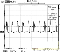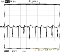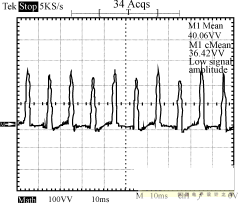 圖8~圖10為輸入電壓220V的條件下,輸出端的負載狀況分別為空載、半載和全載時,輸入端的功率波形圖。由這3個圖可以看出,輸入功率是個脈沖序列,周期為10ms,即每半個工頻周期電源輸入端通過整流橋為輸入平滑濾波電容充一次電。測量輸入功率時串聯(lián)于輸入端的采樣電阻為2.0Ω,因此功率為圖示值除以2。半載時輸出功率為:12.3662/10=15.29W,全載時輸出功率為:12.2552/5=30.04W。電路正常工作時,漏極電壓波形如圖11所示。