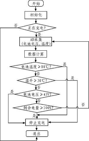 采用充電限壓,電池溫升檢測(cè)策略,如蓄電池電36 V,充電截止電壓42.5-43 V,充電截止溫度80℃,充電截止溫升30℃。不過絕大部分時(shí)間蓄電池基本處于欠充狀態(tài)。同時(shí)通過對(duì)電池電壓的數(shù)據(jù)實(shí)時(shí)采集,利用軟件控制對(duì)電池采取限壓保護(hù):通過實(shí)時(shí)計(jì)算電池電量進(jìn)行防過充過放保護(hù),電量為100%時(shí)停止充電,電量為20%時(shí)停止放電,為延長(zhǎng)其壽命,做了第二道防線。圖1 為蓄電池過充保護(hù)流程圖。