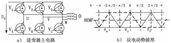圖2 逆變器主電路和點(diǎn)擊的反電動勢波形圖
