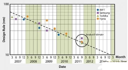 雖然數(shù)碼相機(jī)歷來(lái)需要很大的存儲(chǔ)容量,但對(duì)手機(jī)而言,這種要求只是在近幾年才變得重要起來(lái)。幸運(yùn)的是,固態(tài)存儲(chǔ)器的密度和容量在逐漸增加,其價(jià)格($/MB)和面積(mm2/MB)隨之大幅降低。從圖1可看出,在2011年,NAND閃存的制造工藝幾何尺寸可能突破25nm。