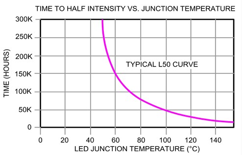 每種照明設備均存在光源使用壽命問題,經(jīng)常遭遇的狀況有類似白熾燈泡的鎢絲突然燒斷,或因長時間使用而使得光源材料因逐漸老化以致變暗而故障,LED亦因組件的接面溫度而出現(xiàn)老化現(xiàn)象。所有的照明設備在提供穩(wěn)定亮度條件下,于一定使用年限后,亮度勢必會逐漸低于有效亮度之下。在不同的照明應用裝置中,皆有使用壽命時間限制。舉例來說,當使用在路燈裝置的亮度已衰減至原先50%時,即代表使用年限,但使用在醫(yī)生內(nèi)視鏡的光源裝置可能亮度尚未衰減那么多。