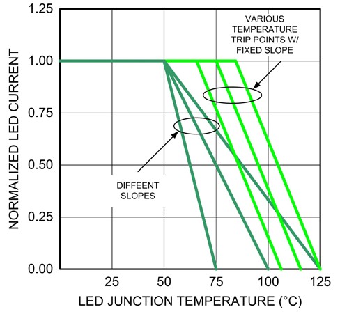 為防止組件遭受破壞或讓使用壽命縮短,必須進行熱能管理,且已有多種方法可以解決此問題。圖2為兩種不同的回折曲線,可在溫度上升時限制LED的電流流量。當接面溫度保持在默認溫度范圍內(nèi)時,就經(jīng)由主要的控制回路作為電流調(diào)節(jié);但當接面溫度超過默認范圍時,就會使用另一組控制回路限制電流大小。其中接面溫度的回折點與驅(qū)動電流的衰減率,均可依照不同的應用和LED制造商的建議改變。