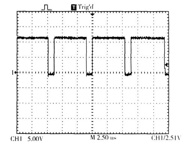 通過示波器采樣肖特基二極管兩端的波形,同樣以3 顆LED 負(fù)載為例進(jìn)行采樣。