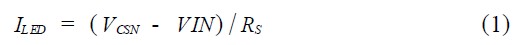 保持采樣端(CSN) 輸入電壓值為IC 內(nèi)部設(shè)定值相對于VIN 電壓值不變即可實現(xiàn)恒流。因為: