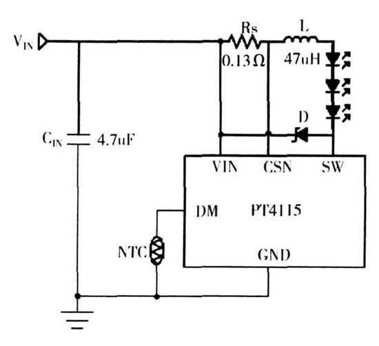 4) PT4115 內(nèi)部自帶過溫保護(hù)功能,外部過溫保護(hù)可設(shè),對LED 實現(xiàn)雙重保護(hù);