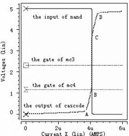 現(xiàn)以圖4為例闡述電流極限比較器的工作情況。此時(shí)極限電流為4μA,其虛線代表cascode結(jié)構(gòu)的輸出電壓波形,黑色實(shí)線代表反相器的輸出電壓波形即與非門的輸入電壓波形,另外兩條點(diǎn)劃線分別代表cascode結(jié)構(gòu)中Mc3和Mc4的柵電壓波形。