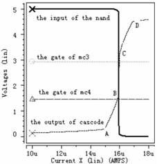 從虛線即cascode結(jié)構(gòu)的輸出電壓波形可以看出,電流極限比較器的工作過程分為五個(gè)階段,第一階段:檢測(cè)電流從0慢慢上升到A,在此過程中,由于檢測(cè)電流遠(yuǎn)小于極限電流,強(qiáng)迫Mc3和Mc4都工作于線性區(qū)。第二階段:檢測(cè)電流從A上升到B,cascode結(jié)構(gòu)的輸出電壓也隨著上升,使Mc4工作于飽和區(qū),Mc3工作于線性區(qū)。但是Mc4只是剛剛進(jìn)入飽和區(qū),還受溝道調(diào)制因素影響,這可從圖中很清析地看出當(dāng)cascode結(jié)構(gòu)的輸出電壓隨檢測(cè)電流上升時(shí),Mc4中電流慢慢接近所設(shè)定的極限電流。第三階段:檢測(cè)電流從B上升到C,此時(shí)檢測(cè)電流已上升到所設(shè)定的極限電流,Mc3和Mc4都工作于飽和區(qū),同時(shí)cascode結(jié)構(gòu)的輸出電壓也上升到后面反相器的中點(diǎn)電壓,經(jīng)過后續(xù)控制電路關(guān)斷功率管。第四階段:檢測(cè)電流從C上升到D,此時(shí)檢測(cè)電流大于所設(shè)定的極限電流,迫使Mc5工作于線性區(qū),雖Mc6還工作于飽和區(qū),但受溝道調(diào)制因素影響,另外Mc3和Mc4工作于飽和區(qū)。第五階段:檢測(cè)電流從D繼續(xù)往上升,迫使Mc5和Mc6都工作于線性區(qū),Mc3和Mc4工作于飽和區(qū)。從圖4中可以看出,當(dāng)檢測(cè)電流達(dá)到4.1μA時(shí),關(guān)斷功率管,滿足系統(tǒng)要求。圖5--圖7的工作情況與圖4類似,圖5設(shè)定極限電流為16μA,可以看出當(dāng)檢測(cè)電流達(dá)到15.97μA時(shí),關(guān)斷功率管。圖6設(shè)定極限電流為24μA,可以看出當(dāng)檢測(cè)電流達(dá)到23.82μA時(shí),關(guān)斷功率管。圖7設(shè)定極限電流為40μA,可以看出當(dāng)檢測(cè)電流達(dá)到39.6μA時(shí),關(guān)斷功率管。