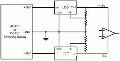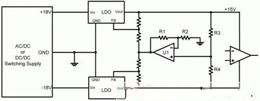 圖2顯示了一個典型運算放大器電源電路的示意圖。此處,一個開關電源提供一個正18V和一個負18V。兩低壓降(LDO)線性穩(wěn)壓器進一步將±18V調節(jié)至±15V。該LDO一般安裝在電源和運算放大器之間,旨在降低開關電源產(chǎn)生的高頻開關噪聲。LDO具有較高的電源抑制(以比率表示,PSRR),其減弱了寬帶頻率下LDO輸入的噪聲。