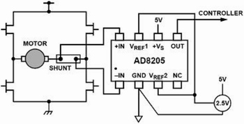 如圖5所示連接,AD8205在H橋馬達(dá)控制電路中作為控制回路的一部分,馬達(dá)和采樣電阻串連后放置在H橋的中間,通過檢測采樣電阻上的電壓,可以準(zhǔn)確地測量馬達(dá)當(dāng)前的電流及其方向。此時(shí),AD8205的輸出被設(shè)定成外部參考雙向的方式,這樣它可以測量H橋開關(guān)的雙向電流并同時(shí)監(jiān)測馬達(dá)的運(yùn)轉(zhuǎn)方向。由于地不是一個(gè)特別穩(wěn)定的參考電平,以地為參考將會(huì)導(dǎo)致測量的不準(zhǔn)確性。因此,這種測試方案要比以地作為參考電平的測試方法好的多。