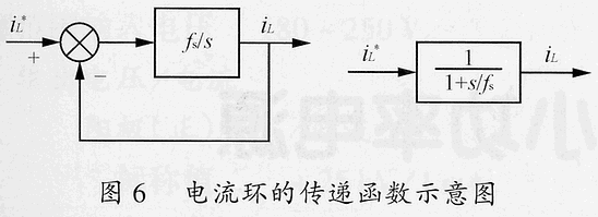 將s=2πfc代入上式,并令上式等于1時(shí),可得環(huán)路的剪切頻率fc=fs/(2π)。因此,可將電流環(huán)等效為延時(shí)時(shí)間常數(shù)為一個(gè)開(kāi)關(guān)周期的純慣性環(huán)節(jié),如圖6所示。顯然,當(dāng)電流誤差放大器的增益GCA小于最優(yōu)值時(shí),電流響應(yīng)的延時(shí)將會(huì)更長(zhǎng)。