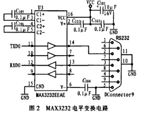 系統(tǒng)產(chǎn)生的信號需要經(jīng)過電平變換,轉(zhuǎn)換成RS-232電平,與計算機通信。這里采用MAX3232為核心電平變換電路。其原理圖如圖2所示。