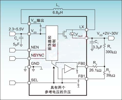 如上所述,當(dāng)OLED工作在暗的模式時可以通過降低輸出電壓顯著地節(jié)省功耗。因此為OLED電源選擇的最佳電源芯片應(yīng)包含能夠提供這一功能的電路。采用兩條獨(dú)立的反饋路徑就可實(shí)現(xiàn)這一功能,而且這兩條反饋路徑可以通過簡單的邏輯輸入進(jìn)行選擇。因此通過這種方法就可簡單地實(shí)現(xiàn)PMOLED中使用的亮→暗→關(guān)節(jié)電技術(shù)。