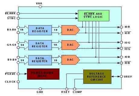 因此,假如有一個1024×1024@60Hz的圖像系統(tǒng),回掃因子為0.8。那么:時鐘頻率=點速率=1024×1024×60/0.8=76.8Hz。所要求DAC的時鐘頻率是78.6MHz。CS7123的最大時鐘頻率為240MHz,因此可以支持最高達到1600×1200@100Hz的分辨率。