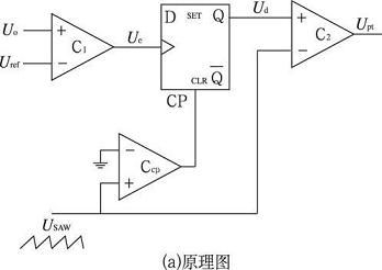 本節(jié)設(shè)計(jì)一種簡單實(shí)用的脈沖序列控制器, 如圖2 所示。圖2 中時(shí)鐘信號(hào)CP( Clock Pulse) 由峰峰值為- 10 V到+ 10 V 的鋸齒波信號(hào)USAW 與電壓信號(hào)UGN D ( UGND = 0) 通過比較器Ccp產(chǎn)生; 變換器輸出電壓Uo 與基準(zhǔn)電壓Uref 通過比較器C1 產(chǎn)生電壓信號(hào)Ue;觸發(fā)器D 在時(shí)鐘來臨時(shí)刻將電壓信號(hào)Ue 傳遞至輸出端Q, 并在下一時(shí)鐘來臨之前保持不變; 比較器C2 將D 觸發(fā)器的輸出信號(hào)和鋸齒波進(jìn)行比較產(chǎn)生控制脈沖PH 或PL 實(shí)現(xiàn)對變換器的控制。