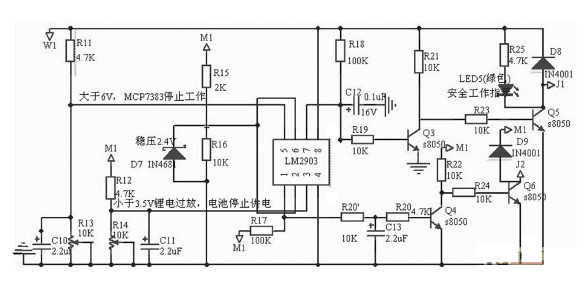 過電壓保護控制,具體電路如圖3所示:整流二極管D4 接過電壓保護繼電器JDQ1輸出。 充電控制管理芯片MCP73831最大輸入電壓為6V. 雖然供電網(wǎng)絡(luò)基本輸出電壓為5V,但當(dāng)光照強度發(fā)生劇烈變化或負載變化較大時,輸出電壓仍然會有一定波動,為保護MCP73831不因短時的電壓波動而損壞,設(shè)計了過電壓保護控制器。 當(dāng)W1 的電壓超過6V, JDQ 1會斷開輸出電路,MCP73831因斷電而得到保護。 具體分析如下:此部分電路設(shè)計主要采用了LM 2903電壓比較器和外圍電路擴展而成。 LM 2903包含兩路比較器,1, 2, 3腳為一路, 1腳為OU TPU TA, 2, 3腳為IN PU TA. 5, 6, 7腳為另一路, 7腳為OU TPU TB, 5, 6腳為IN PU TB. 其中過電壓保護控制器用5, 6, 7腳的比較器。電阻R11 , R13分壓后接至比較器的5腳。 當(dāng)電壓大于6V 即分壓值大于214V. 比較器的7腳輸出電平由低轉(zhuǎn)為高。 Q3 飽和導(dǎo)通,則Q5 截止,安全工作指示燈熄滅,接點J1為高電平,此時JDQ 1開始工作,供電電路與后續(xù)電路斷開,同時過電壓紅色警示燈亮起。