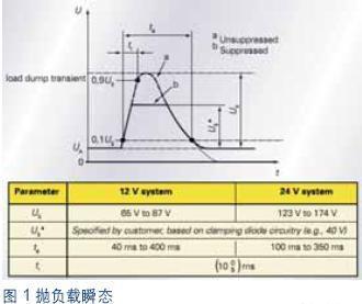 幾乎所有直接連接至汽車電池的電子組件和電路都要求保護(hù),以免于受到抑制、瞬態(tài)電壓(高達(dá)60V)和反向電壓狀態(tài)的損害。對于這些電子電路而言,必須能夠經(jīng)受住電源線路上一定程度的過電壓,這也是種常見的要求。對于那些要求任何特殊車載電子系統(tǒng)的主電源輸入均能夠在各種不同瞬態(tài)電壓狀態(tài)(包括交流發(fā)電機(jī)拋負(fù)載)下工作的車載系統(tǒng)來說尤為如此。