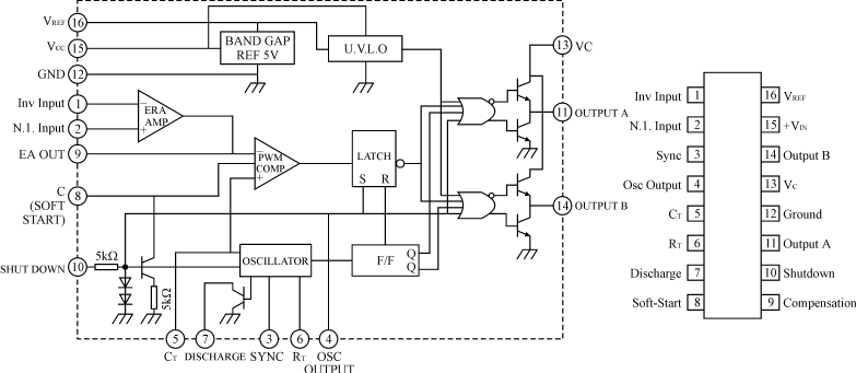 圖3 SG3525的內部結構圖和封裝圖