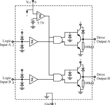 MC34152的外圍電路簡單,應用方便。它是8管腳的同相推挽驅動芯片,具體的內部結構和封裝如圖4所示。腳2與腳4為兩路控制信號輸入,經過芯片內部的推挽放大,直接輸出同相的兩路驅動信號(腳7及腳5)。為使芯片更加穩(wěn)定地工作,一般在芯片的電源端并聯(lián)一個濾去高頻干擾的瓷片電容和一個濾去低頻干擾的電解電容。
