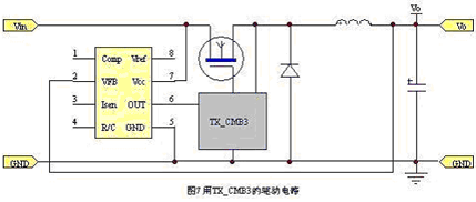 圖7示出的是采用TX_CMB3型驅(qū)動模塊的斬波電路,該驅(qū)動組件是北京落木源公司(www.pwrdriver.com)新開發(fā)出的單管隔離驅(qū)動器。該款驅(qū)動器使用變壓器隔離,采用分時技術(shù),在輸入信號的上升和下降沿傳遞PWM的信號,在平頂階段傳遞能量,因而能夠輸出陡峭的驅(qū)動脈沖。這種驅(qū)動方法的優(yōu)點是使用方便(在MOSFET功率不大時,只要如圖7連接就可以了),驅(qū)動脈沖質(zhì)量好,工作頻率高,體積較小,輸入電壓最高可達1000V,價格也比較便宜。缺點是工作頻率低時要求的變壓器體積比較大,同時成本稍高些,但考慮到簡化了設(shè)計、并降低了裝配成本,總成本可能還要低些。