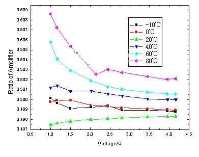 (2) 電壓檢測(cè)電路的誤差。電壓檢測(cè)電路中的誤差主要來(lái)自于電阻對(duì)的偏差以及三極管的偏差。對(duì)電壓檢測(cè)電路在不同溫度下的放大倍數(shù)進(jìn)行了實(shí)驗(yàn),結(jié)果如圖4所示。