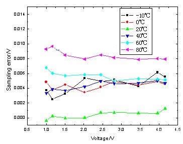 光電繼電器部分的檢測(cè)誤差不僅隨著溫度變化,同時(shí)也隨著被測(cè)量的電壓值變化,從圖3中可以看到,同一測(cè)量溫度下,1V與4V的被測(cè)量電壓之間的測(cè)量誤差達(dá)到12mV。從圖5中可以看到,而采樣系統(tǒng)的誤差僅僅同溫度有關(guān),而與被測(cè)量電壓值無(wú)關(guān)。