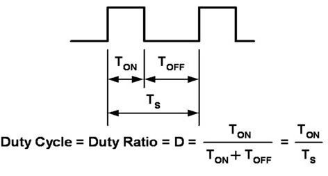 為LED提供脈波電流的方法也稱作PWM,這種方法已經(jīng)成為改變光等級的首選方法。LED本身是矽元件,對應流經(jīng)它們的電流導通及關閉而快速地導通和關閉。開關時間在100奈秒(ns)等級,相當于最大頻率10MHz。應用通常以100Hz~100kHz的頻率工作。頻率低于100Hz時,人眼會觀察到LED光閃爍。頻率在500Hz~20kHz之間時,電路可能產(chǎn)生能聽到的雜訊。調(diào)光是通過在單個開關周期的某部分時間內(nèi)將LED導通;而在此開關周期的其余部分時間內(nèi),將LED關閉來實現(xiàn)。這種導通關閉周期稱作工作周期(D),其表達方式為LED導通時間(TON)除以整個開關/導通周期時間(TS)(圖3)。
