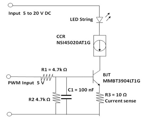 采用簡單的CCR及雙極結晶體管和PWM訊號控制的LED能夠輕易地調(diào)光至汽車及建筑物照明應用要求的精度。使用雙極結晶體管使LED能夠以恒定電流驅(qū)動,從而不會有色度變化;光的色彩仍然保持一致,僅是LED發(fā)射的光量減小。