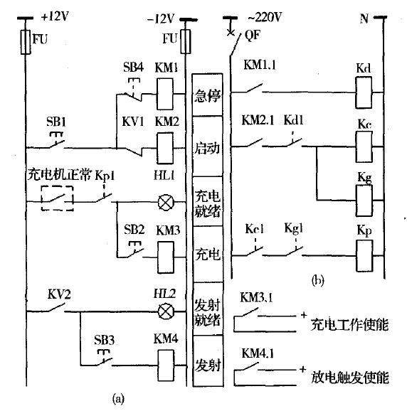 圖3(a)中,KM1-4為SSR,SB1-4為自鎖按鈕。系統(tǒng)上電后,通過按鈕SB1啟動KM1和KM2,這樣Kd將首先得電動作,隨后Kc、Kg、Kp也相繼動作,為下一步進(jìn)行的充電工作做好了準(zhǔn)備。圖3(b)中,Kc和Kg啟動采用了位置接點(diǎn)Kdl,同樣Kp啟動也采用了位置接點(diǎn)Kcl和Kgl,這樣設(shè)計(jì)目的是使控制電路具有了邏輯動作與防誤閉鎖功能。此時(shí)只要充電設(shè)備自檢正常(圖3(a)中"充電機(jī)正常"接點(diǎn)閉合),則燈HI 1指示可以進(jìn)行充電,通過按鈕SB2啟動KM3便可對脈沖電容器組進(jìn)行充電。脈沖電容器電壓達(dá)到預(yù)設(shè)值后,KV動作,常閉接點(diǎn)KV1斷開致使KM2失電,則Kc、Kg、Kp相繼返回,同時(shí)Kp返回又使KM3失電,這樣Kc、Kg斷開,充電機(jī)停止工作,滿足了系統(tǒng)放電前提。此時(shí)燈HL1熄滅、KV2接通,燈HL2指示充電完畢,通過按鈕SB3啟動KM4則可進(jìn)行ETCG發(fā)射。
