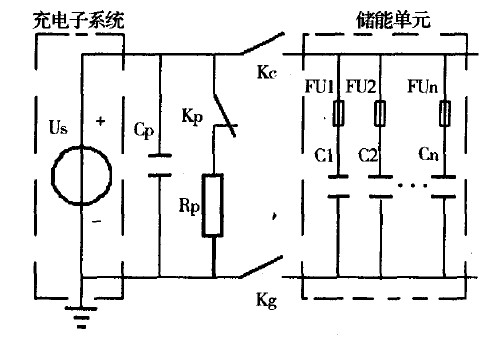 通常,充電子系統(tǒng)內(nèi)部配有過電流、過電壓和過熱等故障保護(hù)或異常告警裝置。但這些裝置的保護(hù)范圍一般僅限于充電子系統(tǒng)內(nèi)部,PPS放電時(shí)浪涌電壓等外部因素仍可能造成充電設(shè)備損壞。因此,在儲能單元和充電子系統(tǒng)間還需配置一些隔離和保護(hù)電路。圖1給出了用于ETCG研究的PPS所配置的充電隔離及保護(hù)電路。圖1中,充電隔離開關(guān)(Kc)和地絕緣隔離開關(guān)(Kg)在充電結(jié)束后打開,用以防止PPS放電時(shí)由負(fù)載等因素產(chǎn)生的浪涌高電壓通過充電子系統(tǒng)對地放電,可以避免因此所造成的充電設(shè)備絕緣損壞;充電輸出終端并聯(lián)了一小容量電容器(Cp)及其安全釋能電路(開關(guān)Kp、電阻Rp),目的在于防止空載誤充電,以避免在此情況下充電電路末端電壓急劇升高損壞充電設(shè)備。