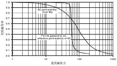 此外,電感磁芯材料也是選擇電感時應(yīng)該加以考慮的重要因素。常用的磁芯材料分為兩大類,一類是粉狀磁芯,以鐵粉芯、High Flux高磁通磁粉芯以及Kool Mμ為代表;另一類是鐵氧體磁芯。兩種磁芯材料各有優(yōu)缺點,設(shè)計人員在選擇的時候,應(yīng)根據(jù)成本、性能、尺寸等因素綜合考慮進(jìn)行選擇。相對粉狀磁芯電感,鐵氧體磁芯的電感具有較低的磁芯損耗,同時具有較高的開關(guān)頻率(高達(dá)MHz)。因此,鐵氧體磁芯通常是此類應(yīng)用的最佳選擇。當(dāng)然,鐵粉磁芯也有其優(yōu)越性,例如鐵粉磁芯的成本相對鐵氧體要低得多;另外,粉狀磁芯的電感隨著流過電感的直流偏置電流的變大要下降得緩慢些,相當(dāng)于具有“軟”飽和特性,而鐵氧體磁芯的電感值在飽和以后就會迅速下降(見圖1),因此在設(shè)計的時候需要留有更多的余量,防止電感出現(xiàn)飽和。如圖1所示,粉狀磁芯的電感值隨著負(fù)載電流的增大下降相對緩慢。鐵粉磁芯往往是用于一些對功耗要求不甚敏感,開關(guān)頻率也不高(<200kHz),但注重成本的應(yīng)用場合。