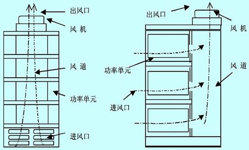 高壓變頻器常風(fēng)的冷卻方式主要為散熱器強制風(fēng)冷、循環(huán)水冷卻和熱管冷卻等。因強制風(fēng)冷方式簡單,不存在水冷時的凝露問題,以及熱管散熱器設(shè)計的復(fù)雜性,在確定合適的通風(fēng)結(jié)構(gòu)的情況下,一般采用此種方式。采用強制風(fēng)冷方式需要在結(jié)構(gòu)設(shè)計時考慮散熱風(fēng)道。散熱風(fēng)道的設(shè)計應(yīng)在充分考慮單元散熱的要求下,應(yīng)盡量優(yōu)化。常見的多電平串聯(lián)方式的高壓變頻器,從結(jié)構(gòu)上分為功率柜體、變壓器柜、控制柜。功率柜風(fēng)道設(shè)計通常有兩種方式:串聯(lián)風(fēng)道和并聯(lián)風(fēng)道。