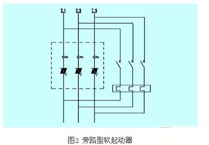 晶閘管在線運行軟起動器,為了解決其大量功耗和熱量問題,給產(chǎn)品制造帶來很大的難度,尤其晶閘管的散熱器要求體積足夠大,還要機械通風(fēng)。由此而帶來技術(shù)難度和材料成本上升,都是成倍增加。而在使用時為了回避其散熱和功耗問題,筆者在1998年直接開發(fā)了旁路型軟起動器,如圖2所示。