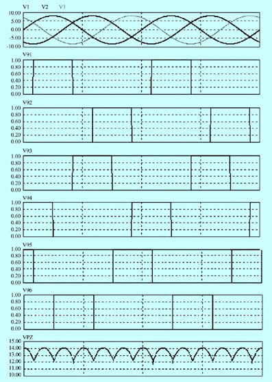 虛擬整流技術(shù)的實現(xiàn),主要通過三相同步檢測電路取得同步控制信號,然后控制功率器件來模擬二極管橋式整流電路對三相交流電進行整流,同時防止輸入的三相交流電相間短路。其原理如圖9所示,是一個輸出方向固定的虛擬整流電路。仿真波形如圖5所示,它們分別是矩陣變換單元的三相輸入電壓、6路同步信號和虛擬整流后得到的輸出電壓波形。