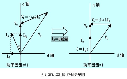 根據(jù)圖4可以知道,要把整流器的功率因數(shù)控制在1.0的話,只要把無功電流設(shè)定值設(shè)為0(id﹡=0),通過整流器控制系統(tǒng)調(diào)節(jié)改變輸出電壓vc的大小和相位,使實(shí)際無功電流分量id=0,那么is=iq+id=iq,is就能與vs保持在同相位,功率因數(shù)控制到了1.0。