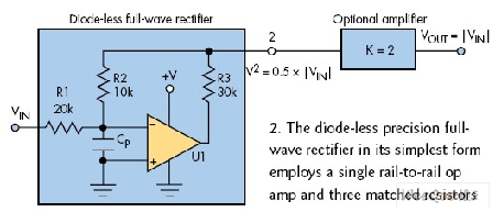 圖2:最簡單的無二極管精精密全波整流器采用單個(gè)軌至軌運(yùn)算放大器和三個(gè)匹配的電阻。