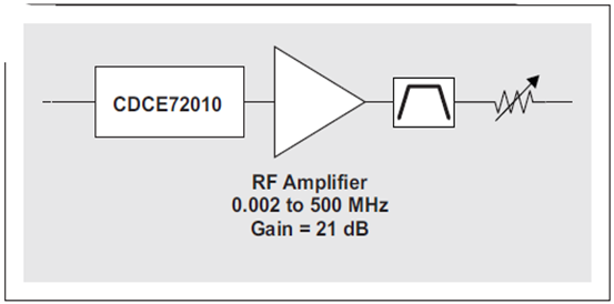 改善轉(zhuǎn)換速率的一種方法是:在 CDCE72010 的 LVCMOS 輸出和帶通濾波器之間添加一個具有相當(dāng)量增益的低噪聲 RF 放大器,參見圖 14。該放大器應(yīng)該放置于濾波器前面,這樣便可以將其對時鐘信號的噪聲影響程度限定在濾波器帶寬,而非 ADC 的時鐘輸入帶寬。由于下一個試驗的放大器具有 21 dB 的增益,因此我們在帶通濾波器后面增加了一個可變衰減器,旨在匹配濾波后 LVCMOS 信號到時鐘生成器濾波后輸出的轉(zhuǎn)換速率。該衰減器可防止 ADC 的時鐘輸入超出最大額定值。