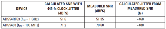我們知道時鐘源生成器濾波后輸出的外部時鐘抖動為 ~35 fs,因此我們可以利用測得的 SNR 結(jié)果,然后對第 1 部分(請參見參考文獻 1)中的方程式 1、2 和 3 求解孔徑抖動值,從而計算得到 ADC 孔徑抖動,請參見下面的方程式 4。表 3 列舉了每種 ADC 測得的 SNR 結(jié)果以及計算得孔徑抖動。