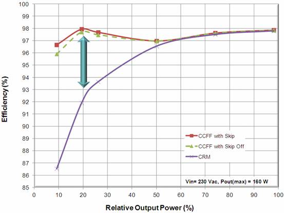 圖5:演示板能效比較(紅色:帶跳周期模式的CCFF;綠色:關(guān)閉跳周期功能的CCFF;紫色:CrM)