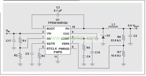 為了說明使用高開關(guān)頻率的權(quán)衡過程,我們設(shè)計了三個獨立電源,其工作頻率分別為100、300和750 kHz。所有這三種設(shè)計,輸入電壓均為48V,輸出電壓均為5V,而輸出電流均為1A。這些要求常用于為一個5-V邏輯USB,或者為其它DC/DC轉(zhuǎn)換器使用的中頻通用5-V總線供電,例如:低壓降穩(wěn)壓器等。若想建立一些設(shè)計限制,所選允許紋波電壓需為50mV,其約為輸出電壓的1%;同時選擇使用0.5 A的峰至峰電感電流。德州儀器TPS54160是一種集成MOSFET的2.5-MHz、60-V、1.5-A降壓DC/DC轉(zhuǎn)換器,用作所有設(shè)計的穩(wěn)壓器。TPS54160特有外部補償和快速可編程頻率,適用于一些高輸入電壓的工業(yè)應(yīng)用。