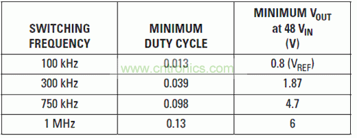 最小可控“導通”時間限制是DC/DC轉(zhuǎn)換器IC的一個特點,其為脈寬調(diào)制(PWM)電路的最窄可達脈寬。在降壓轉(zhuǎn)換器中,開關(guān)周期期間功率MOSFET導通的時間百分比被稱作占空比,其等于輸出電壓與輸入電壓的比。使用TPS54160轉(zhuǎn)換器時,占空比為0.104(4 V/48 V),而數(shù)據(jù)表中列出的最小“導通”時間為130 ns??煽孛}寬限制產(chǎn)生一個最小可達占空比,而用最小“導通”時間乘以開關(guān)頻率,我們可以輕松地計算出該占空比的大小。一旦知道了最小占空比,利用VIN乘以最小占空比,我們便可以計算出最低可達輸出電壓。最低輸出電壓同樣也受轉(zhuǎn)換器基準電壓的限制,使用TPS54160時其為0.8V。