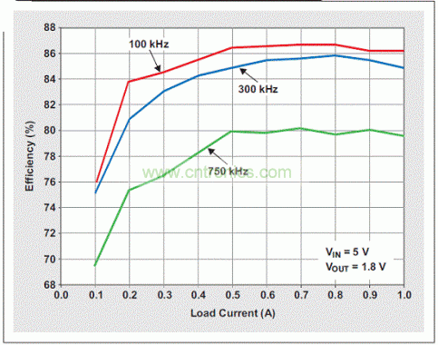 三個例子的重要損耗組成部分,來自于FET驅(qū)動損耗、FET開關(guān)損耗和電感損耗。FET電阻和IC損耗是一致的,因為所有三個設(shè)計中都使用了相同的IC。由于所有例子中都選擇了低ESR的陶瓷電容,因此電容損耗可以忽略不計。為了表明高頻開關(guān)的影響,我們對每個例子的效率都進行了測量,并將其顯示在圖2中。該圖清楚地表明,效率隨開關(guān)頻率增加而下降。若想提高所有頻率下的效率,需要尋找到一種全負載狀態(tài)下低漏到源“導通”電阻、低門電荷或者低靜態(tài)電流規(guī)范的DC/DC轉(zhuǎn)換器;或者尋找到一些具有更低等效電阻的電容和電感。