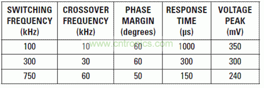 瞬態(tài)響應(yīng)是電源性能級別的一個較好指標。我們利用每種電源的波特圖來表明高開關(guān)頻率的對比情況(參見圖3)。如圖所示,每個電源的相位裕度在45°和55°之間,其表明瞬態(tài)響應(yīng)得到較好的抑制。交叉頻率約為開關(guān)頻率的1/8。使用快速開關(guān)DC/DC轉(zhuǎn)換器時,設(shè)計人員應(yīng)確保電源IC誤差放大器具有足夠的帶寬來支持高交叉頻率。TPS54160誤差放大器的單位增益頻寬一般為2.7 MHz。表5顯示了實際瞬態(tài)響應(yīng)時間以及電壓峰值過沖的相關(guān)值。開關(guān)頻率越高,過沖值便越是更低,原因是更寬的帶寬。